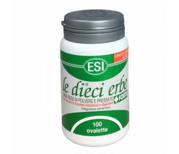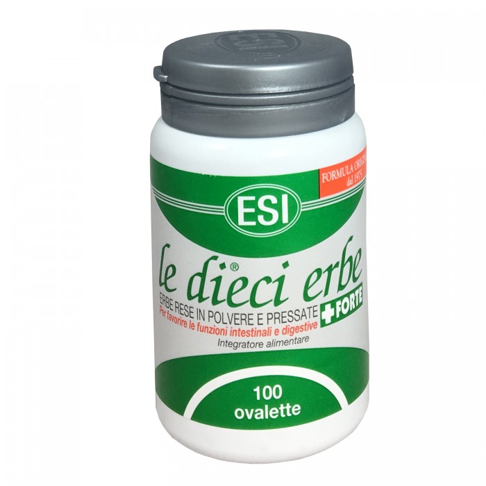 le dieci erbe + FORTE Integratore alimentare 100% origine naturale a base di erbe polverizzate e compresse. Aiuta a regolarizzare la funzione intestinale e a favorire la digestione. Non contiene: conservanti aggiunti, coloranti artificiali, OGM. Adatto ai vegetariani. Cascara sagrada cort.* 267 mg Aloe ferox succo* 200 mg Finocchio frutti** 167 mg Senna foglie* 133,3 mg Liquirizia radice** 50 mg Genziana radice** 50 mg Tarassaco radice** 33,3 mg Rhamnus alpino cort.* 33,3 mg Rabarbaro radice* 33,3 mg Marrubio erba con fiori** 33,3 mg * Favorisce le funzioni intestinali. ** Favorisce le funzioni digestive. Modalità d'uso Si consiglia l?assunzione di 1-2 ovalette, alla sera prima di coricarsi. Avvertenze Per donne in gravidanza o in allattamento e bambini si raccomanda di sentire il parere del medico. Non superare la dose giornaliera raccomandata. Tenere fuori dalla portata dei bambini al di sotto dei 3 anni di età. Gli integratori non vanno intesi come sostituti di una dieta variata. Formato 100 ovalette. Cod. 0247