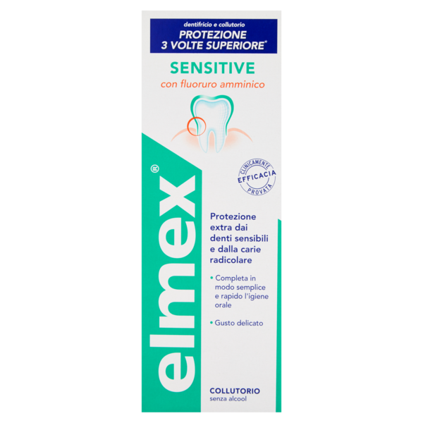> il fluoruro amminico, la cui efficacia è clinicamente provata da numerosi studi, forma uno strato protettivo di lunga durata intorno al colletto dentale per prevenire la sensibilità dentale e la carie radicale.