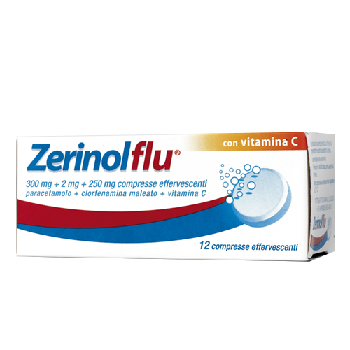 Non somministrare per oltre 3 giorni consecutivi senza consultare il medico. Se la febbre persiste per più di tre giorni oppure se i sintomi non migliorano e ne compaiono altri entro tre giorni oppure sono accompagnati da febbre elevata, esantema, quantità eccessiva di muco e tosse persistente, consultare il medico prima di continuare la somministrazione. Paracetamolo: Durante il trattamento con Zerinolflu controllare che non venga assunto contemporaneamente nessun altro medicinale contenente paracetamolo, poiché se il paracetamolo è assunto a dosi elevate si possono verificare gravi reazioni avverse. Invitare il paziente a contattare il medico prima di associare qualsiasi altro farmaco. Vedere anche il paragrafo 4.5. Dosi elevate o prolungate del prodotto possono provocare un'epatopatia ad alto rischio (vedere anche il paragrafo 4.9) ed alterazioni a carico del rene e del sangue anche gravi. In caso di reazioni di ipersensibilità acuta al paracetamolo (ad es. shock anafilattico), il trattamento con Zerinolflu deve essere interrotto e devono essere attuate le misure mediche necessarie in base ai segni e ai sintomi. Clorfenamina maleato: Alle comuni dosi terapeutiche gli antistaminici presentano reazioni secondarie assai variabili da soggetto a soggetto e da composto a composto. L'effetto secondario più frequente è la sedazione che può manifestarsi con sonnolenza; di ciò debbono essere avvertiti coloro che possono condurre autoveicoli o attendere ad operazioni che richiedono integrità del grado di vigilanza (vedere paragrafo 4.7). Acido ascorbico: L’acido ascorbico (vitamina C) deve essere usato con cautela da soggetti che soffrono, o abbiano sofferto in passato, di nefrolitiasi (calcolosi renale) e da quelli affetti da deficit di G6PD (Glucosio-6-fosfato-deidrogenasi), emocromatosi, talassemia o anemia sideroblastica. Pazienti con insufficienza renale o epatica: Somministrare con cautela nei soggetti con insufficienza renale od epatica. Anziani: Particolare attenzione va posta nel determinare la dose negli anziani per la loro maggiore sensibilità verso il farmaco. Nei pazienti anziani in trattamento con antistaminici si possono verificare con maggiore probabilità effetti quali vertigini, sedazione, confusione e ipotensione. I pazienti anziani sono particolarmente sensibili agli effetti secondari anticolinergici degli antistaminici quali secchezza della bocca e ritenzione urinaria (specialmente negli uomini). Zerinolflu compresse effervescenti contiene: Aspartame: Questo medicinale contiene una fonte di fenilalanina. Può essere dannoso se affetto da fenilchetonuria (mancanza dell’enzima fenilalanina idrossilasi). Sorbitolo: I pazienti affetti da rari problemi ereditari di intolleranza al fruttosio non devono assumere questo medicinale. Sodio: Una compressa effervescente contiene 14,83 mmol di sodio. Da tenere in considerazione nei pazienti con ridotta funzionalità renale o che seguono una dieta a basso contenuto di sodio.